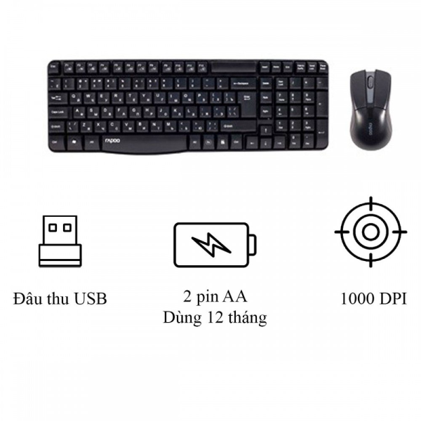Bộ bàn phím thương hiệu Rapoo nổi tiếng với độ bền, đẹp và đạt chất lượng cao. Bàn phím sử dụng 2 viên pin AAA, chuột sử dụng 1 viên pin AA thay thế được. Bộ bàn phím và chuột không dây Rapoo X1800 màu đen có tuổi thọ pin sử dụng rất lâu giúp người dùng tiết kiệm chi phí và công bị gián đoạn công việc.