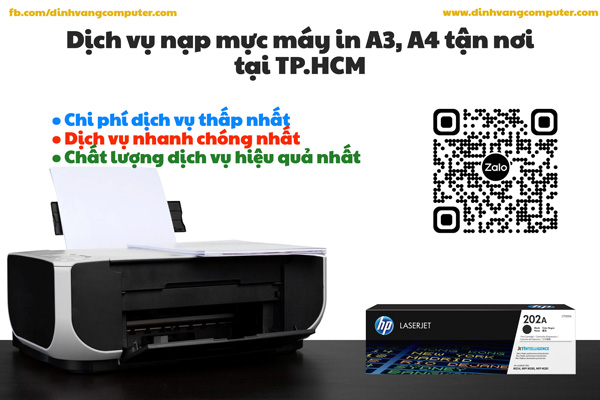 Với nhu cầu sử dụng các thiết bị hiện nay nói chung và các thiết bị văn phòng nói riêng, Đỉnh Vàng Computer nhận thấy nhu cầu sử dụng các dịch vụ nạp mực máy in a3, a4 tại Tp.HCM là rất lớn. Nếu như bạn có nhu cầu nạp mực máy in các loại hãy liên hệ ngay với Đỉnh Vàng Computer ngay nhé!