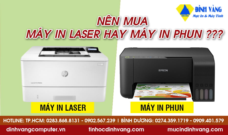 Trong mọi lĩnh vực công việc, đa dạng ngành nghề thì máy in là thiết bị quan trong hỗ trợ công việc in ấn tài liệu. Máy in hiện nay có đa dạng thể loại như: máy in laser, được chia làm máy in laser đen trắng và máy in laser màu. Máy in phun, máy in kim, máy in mã vạch…Trong đó máy in phun và máy in laser là 2 loại máy in phổ biến hiện nay. Nên mua máy in phun và in laser nào? Là câu hỏi mà nhiều người dùng đang quan tâm khi chọn mua máy in.
