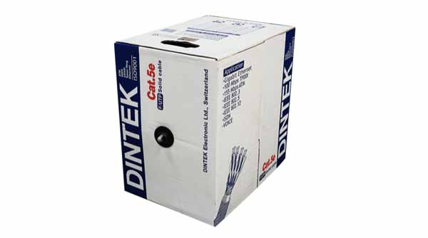 Cáp mạng Dintek Cat5e FTP 305m có màu xám, được đóng gói theo dạng cuộn trong hộp, với chiều dài 1000 feet (305m). Có cấu trúc 4 cặp dây xoắn đôi với chất liệu lõi cấu thành từ đồng nguyên chất giống như loại cáp UTP, ngoài ra có thêm lớp kim loại (Foil) bao quanh các sợi đồng bên dưới vỏ nhựa PVC chất lượng cao. Chính lớp kim loại sẽ giúp chống nhiễu hiệu quả.