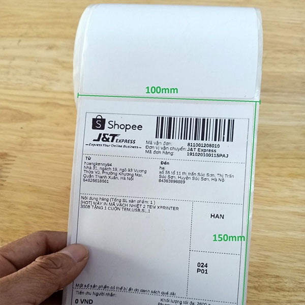 • Decal nhiệt, giấy in nhiệt 100x150mmx50m, tem nhiệt in đơn hàng Shopee, Lazada, Tiki, Sendo,… vận đơn TMĐT, đơn hàng, in phiếu giao hàng khổ 100x150mm (Ngang: 100mm – Dọc 150mm), chuyên dùng để in tem dán, tem nhãn, in vận đơn, phiếu giao hàng TMĐT, in đơn hàng shopee.