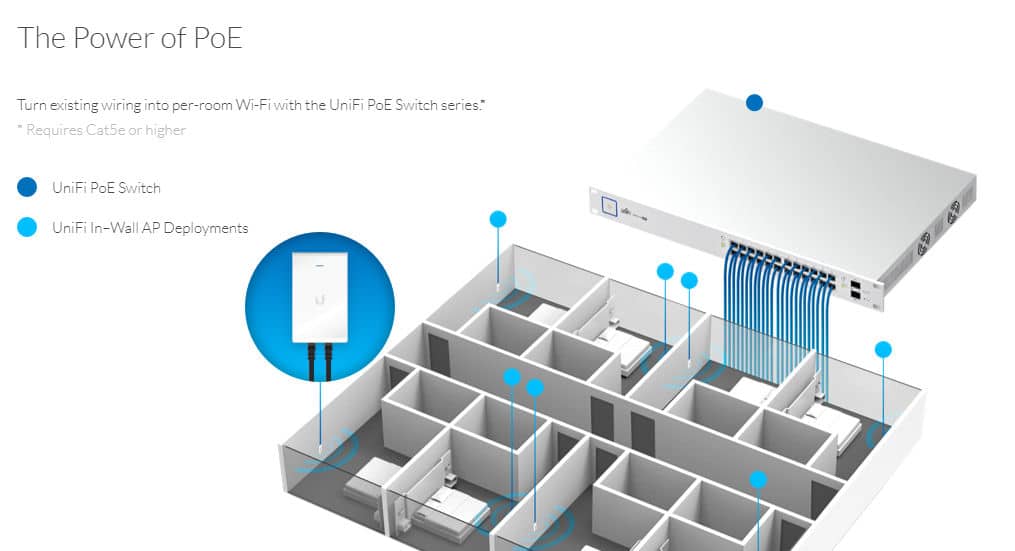 UniFi AC In-Wall được cấp nguồn bằng Switch POE UniFi, biến các giắc mạng âm tường thành bộ phát wifi. Ngoài ra, bạn cũng có thể cấp nguồn cho UniFi AC In-Wall bằng POE Injector 48V của UniFi.
