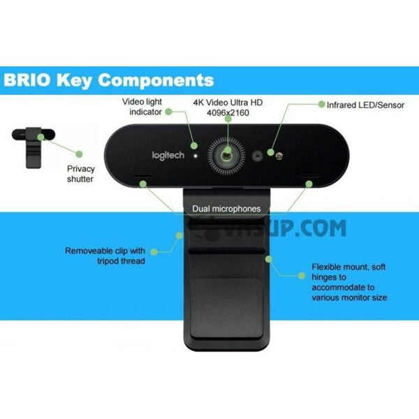 Gắn camera ở bất kỳ đâu cho hiệu quả tốt nhất – màn hình LCD, notebook hoặc trên bàn – bằng kẹp có thể điều chỉnh. Hoặc gắn BRIO trên chân máy ba chân của bạn. Một miếng che có thể tháo ra đậy xuống để đảm bảo tính riêng tư và yên tâm cho bạn.